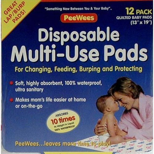 PeeWees Disposable Multi-Use Pads - 12 pk. Great for home or on-the-go, Pee-Wees Disposable Multi-Use Pads help keep all those dirty jobs clean. Made for feeding, changing, or burping your baby, use the soft, 3-ply facial tissue to absorb messes. With its durable moisture barrier and channeled top, its perfect for preventing leaks and protecting clothes, too. Available in a convenient reusable bag, order the Pee-Wees Disposable Multi-Use Pads today!
